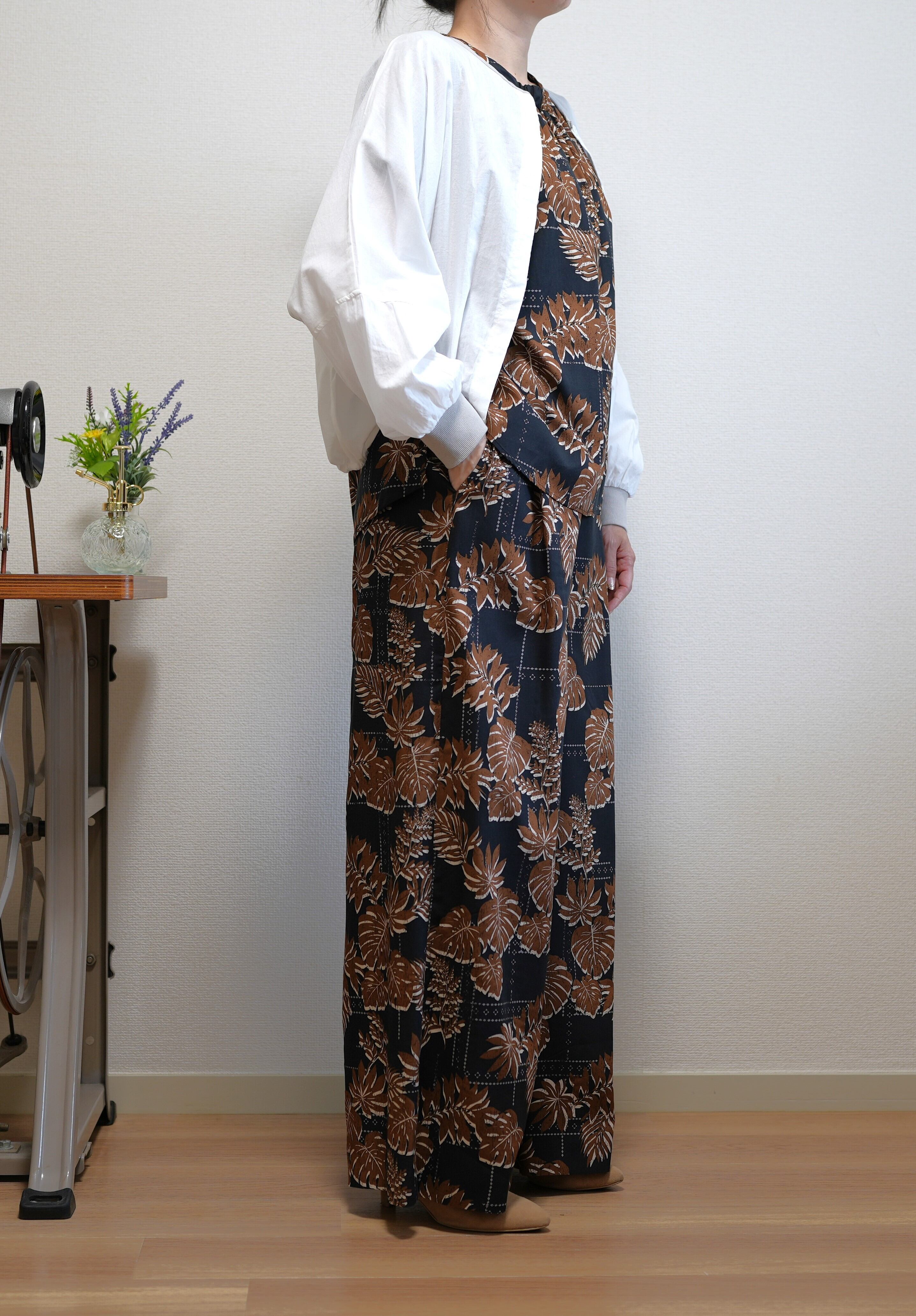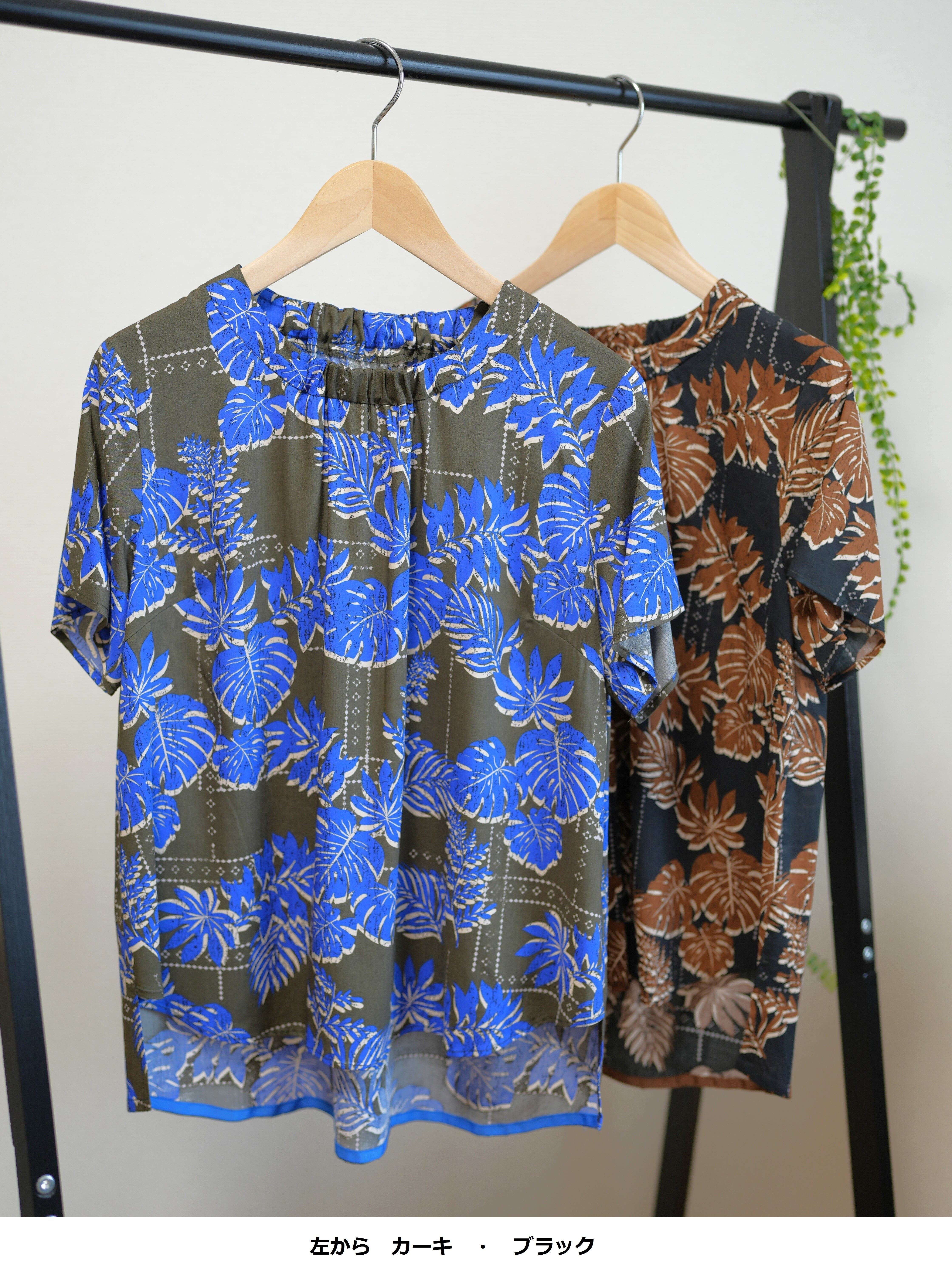 2色カラーの葉柄ボタニカルプリントのブラウスです。
