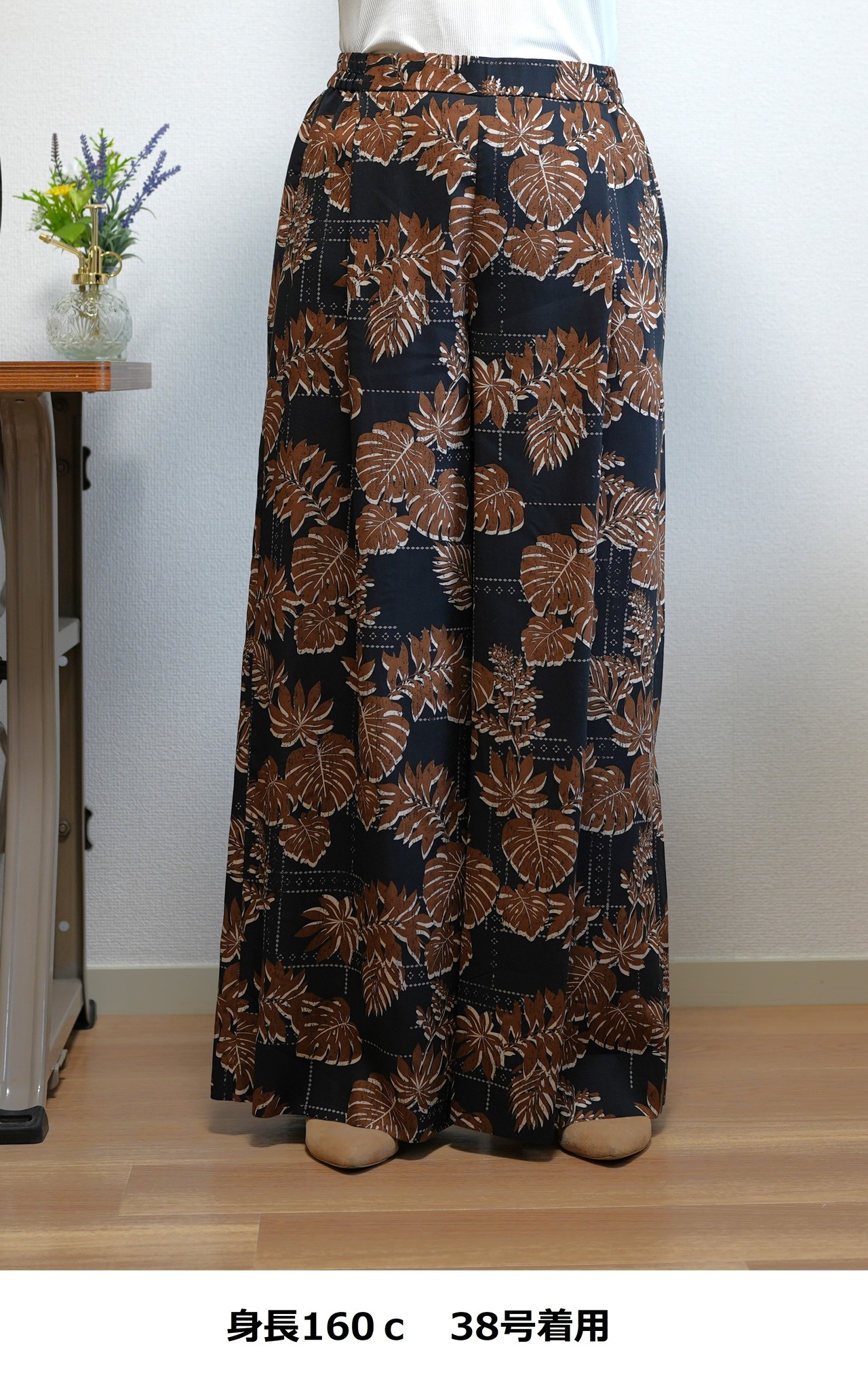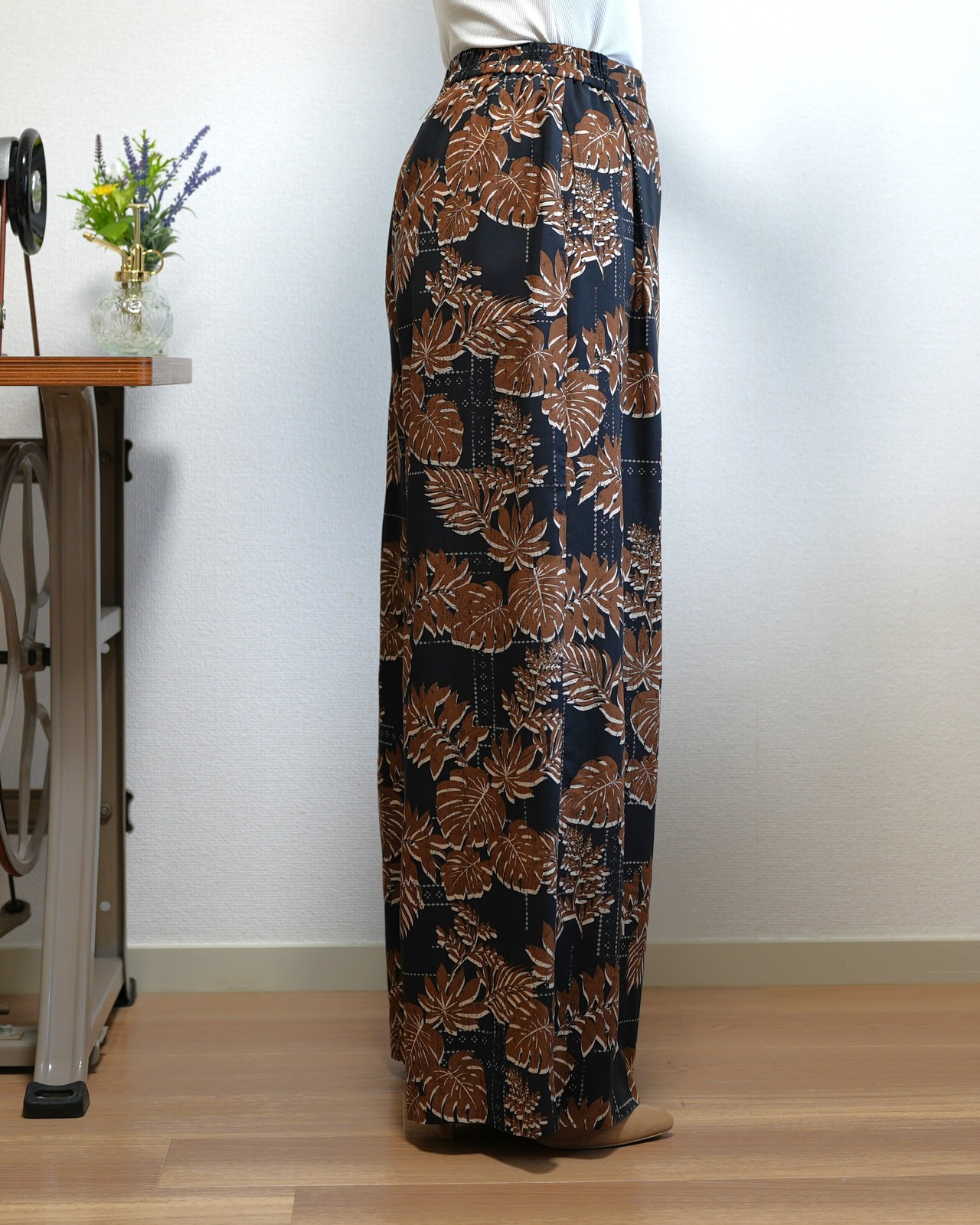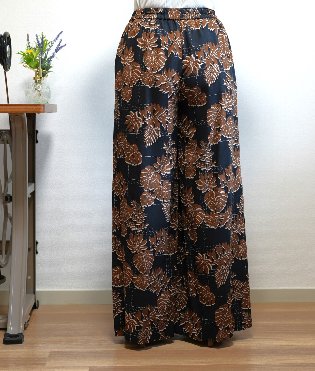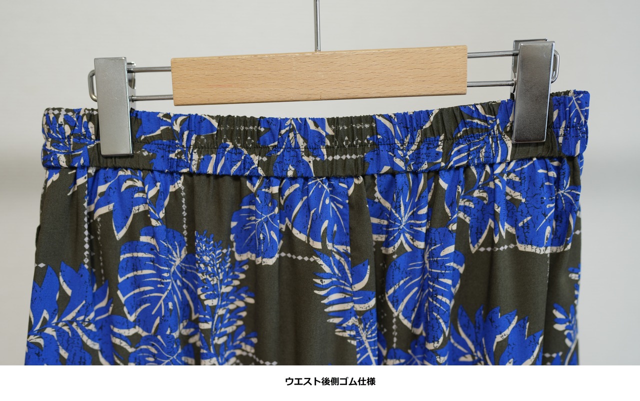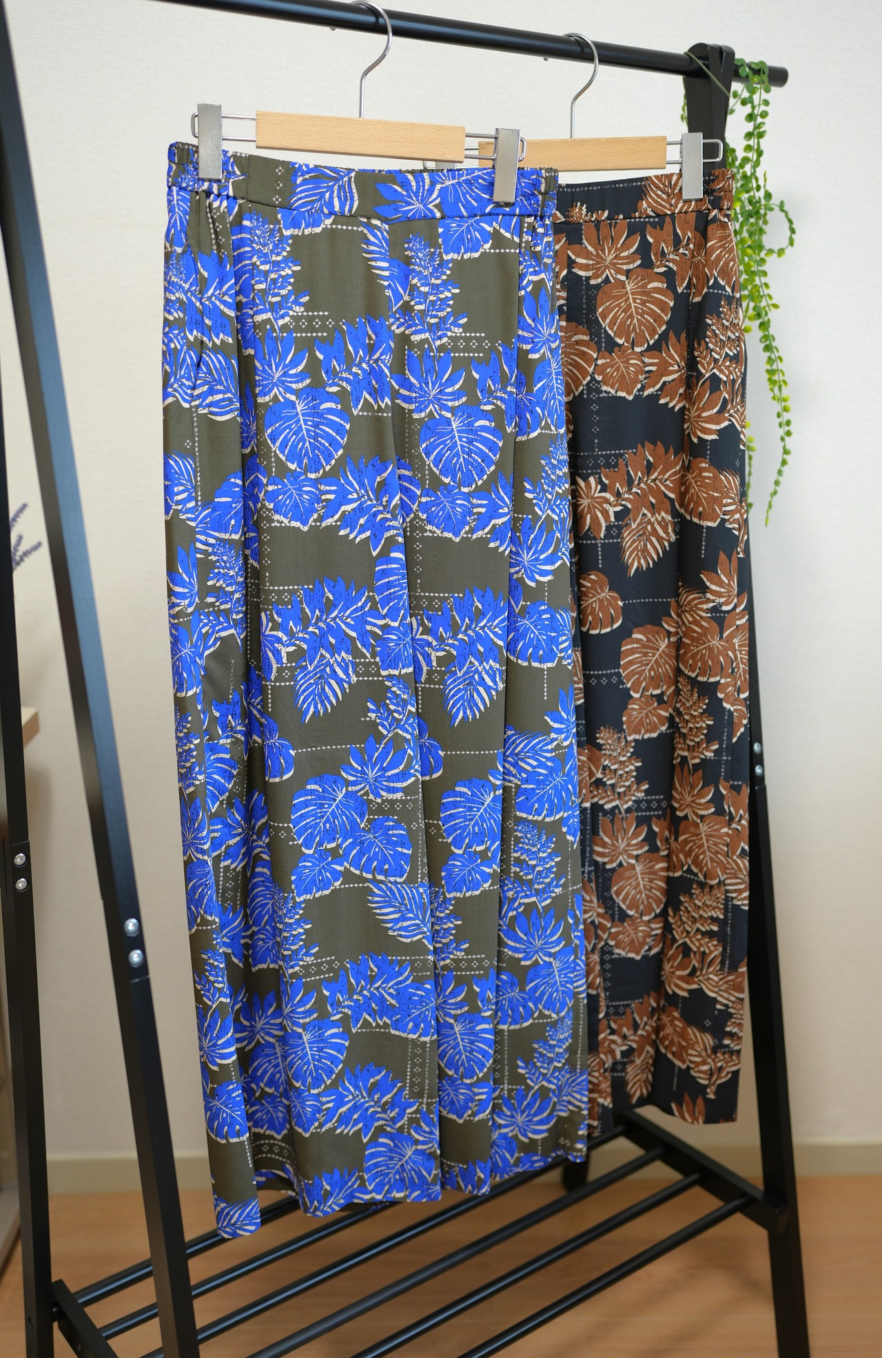 2色カラーの葉柄ボタニカルプリントのパンツです