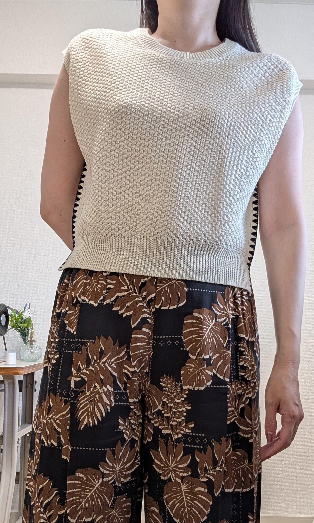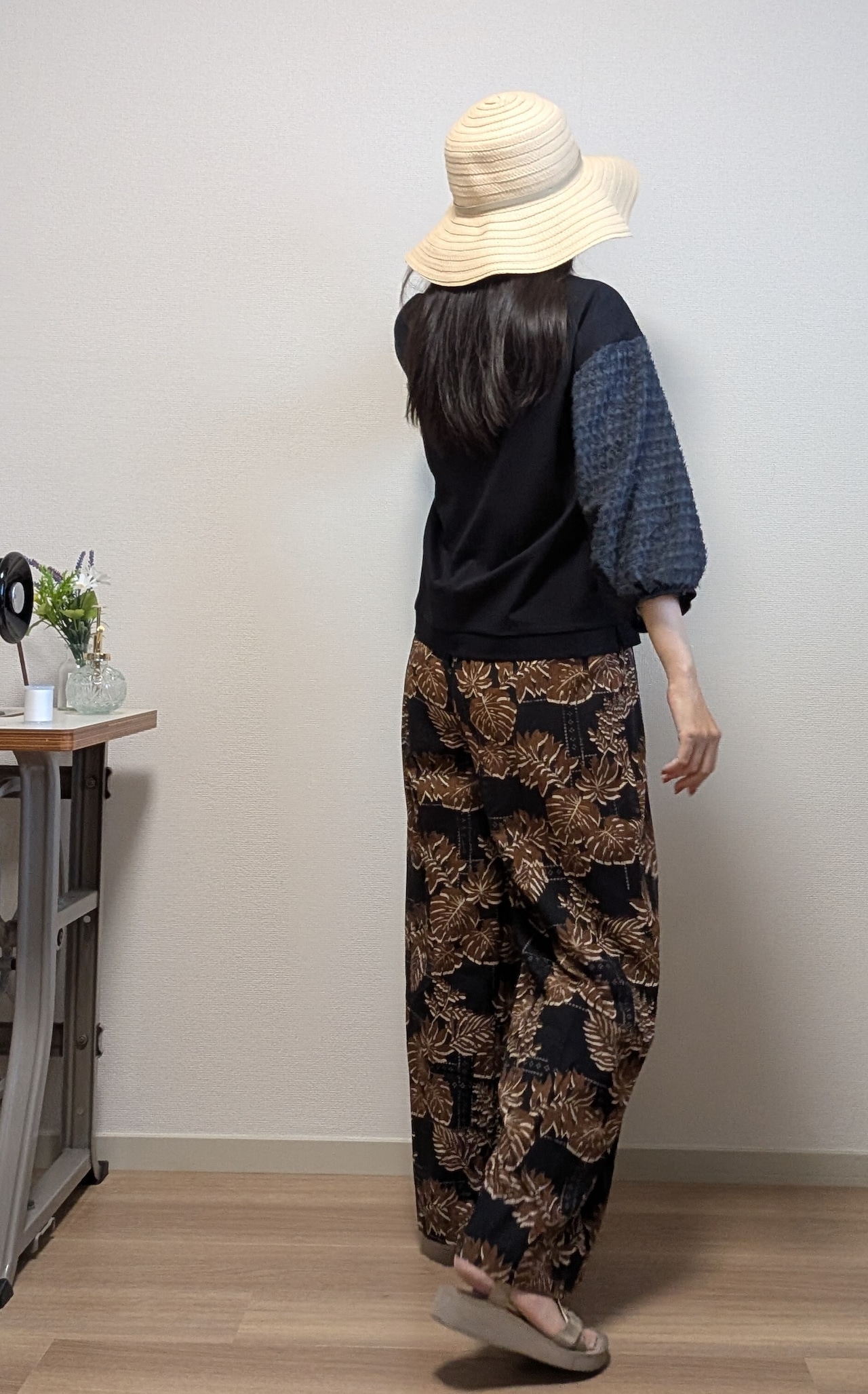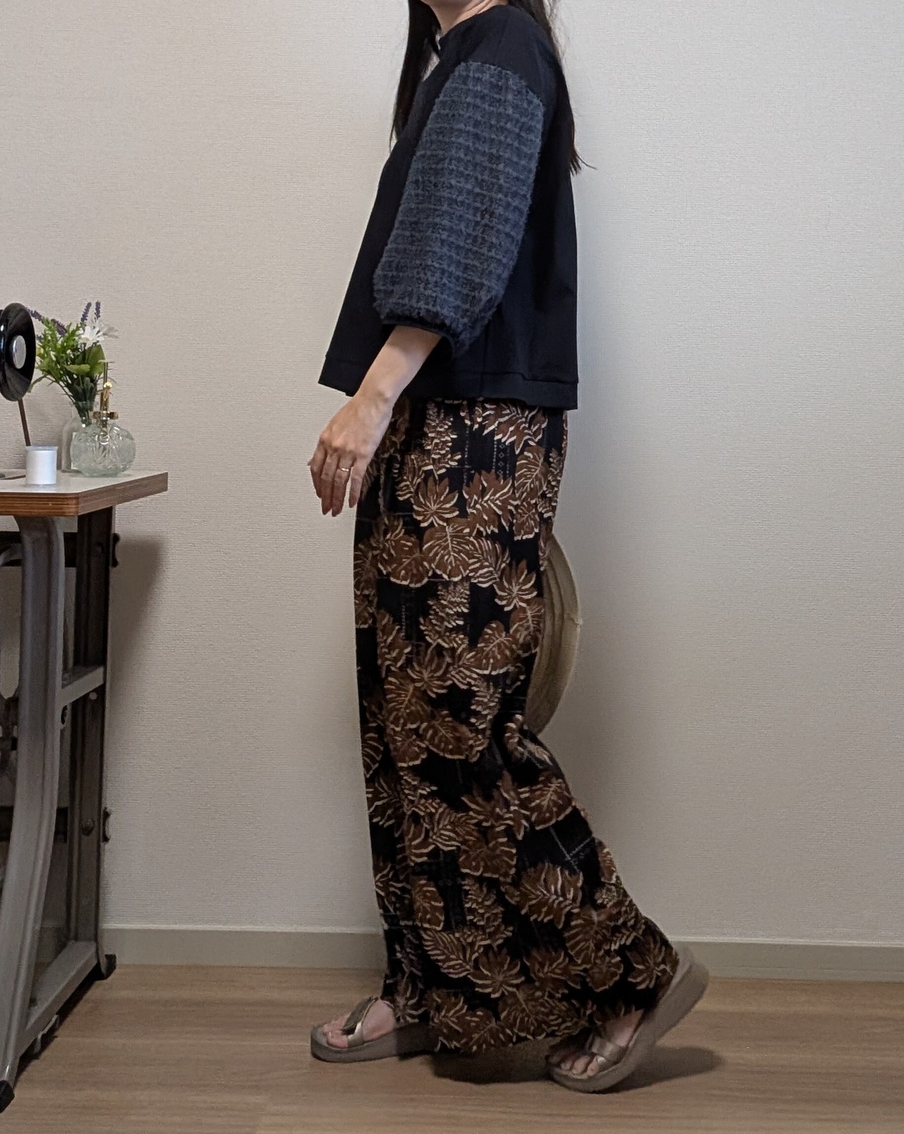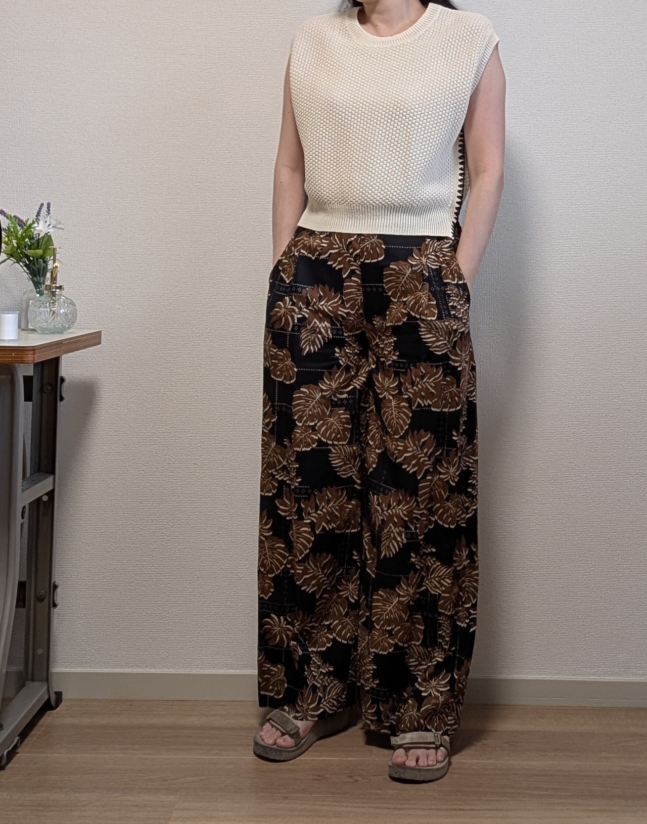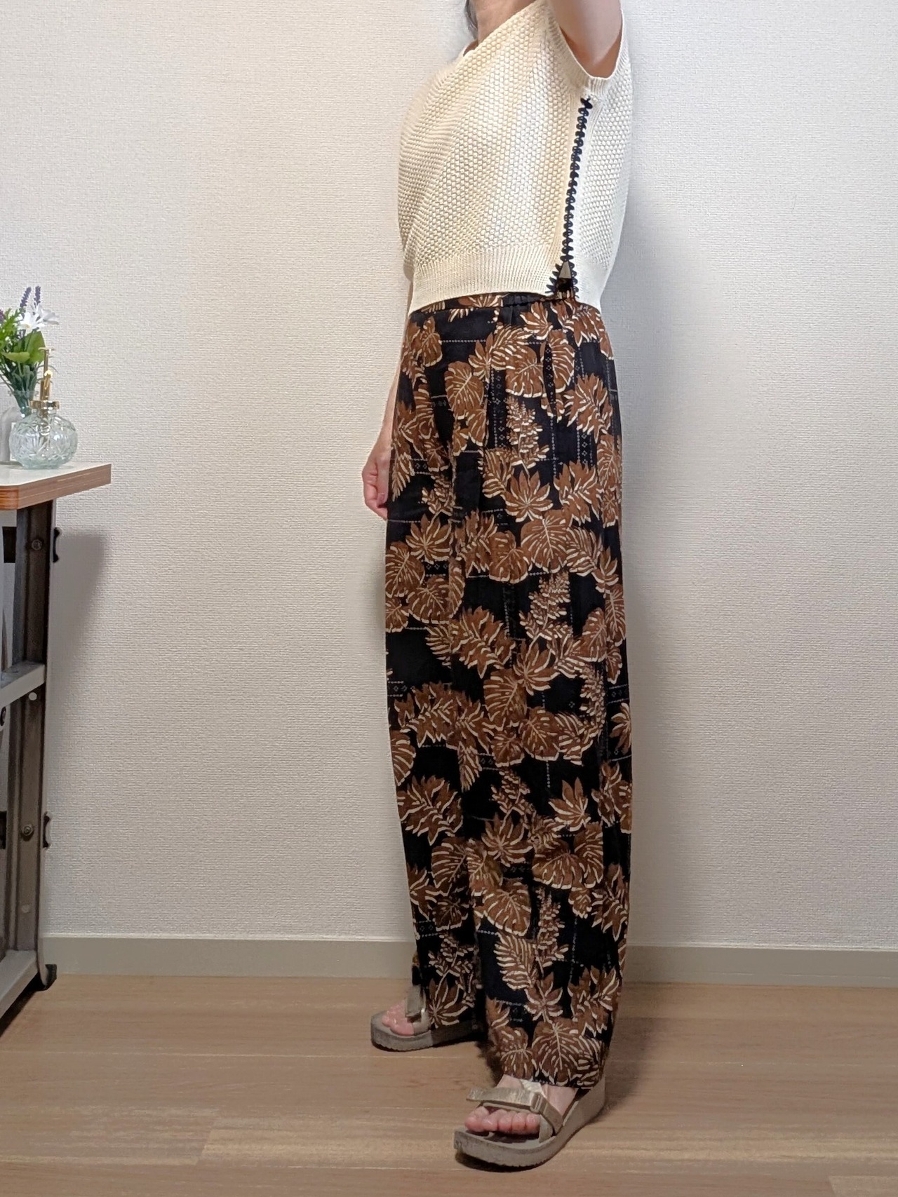 2色カラーの葉柄ボタニカルプリントのパンツです